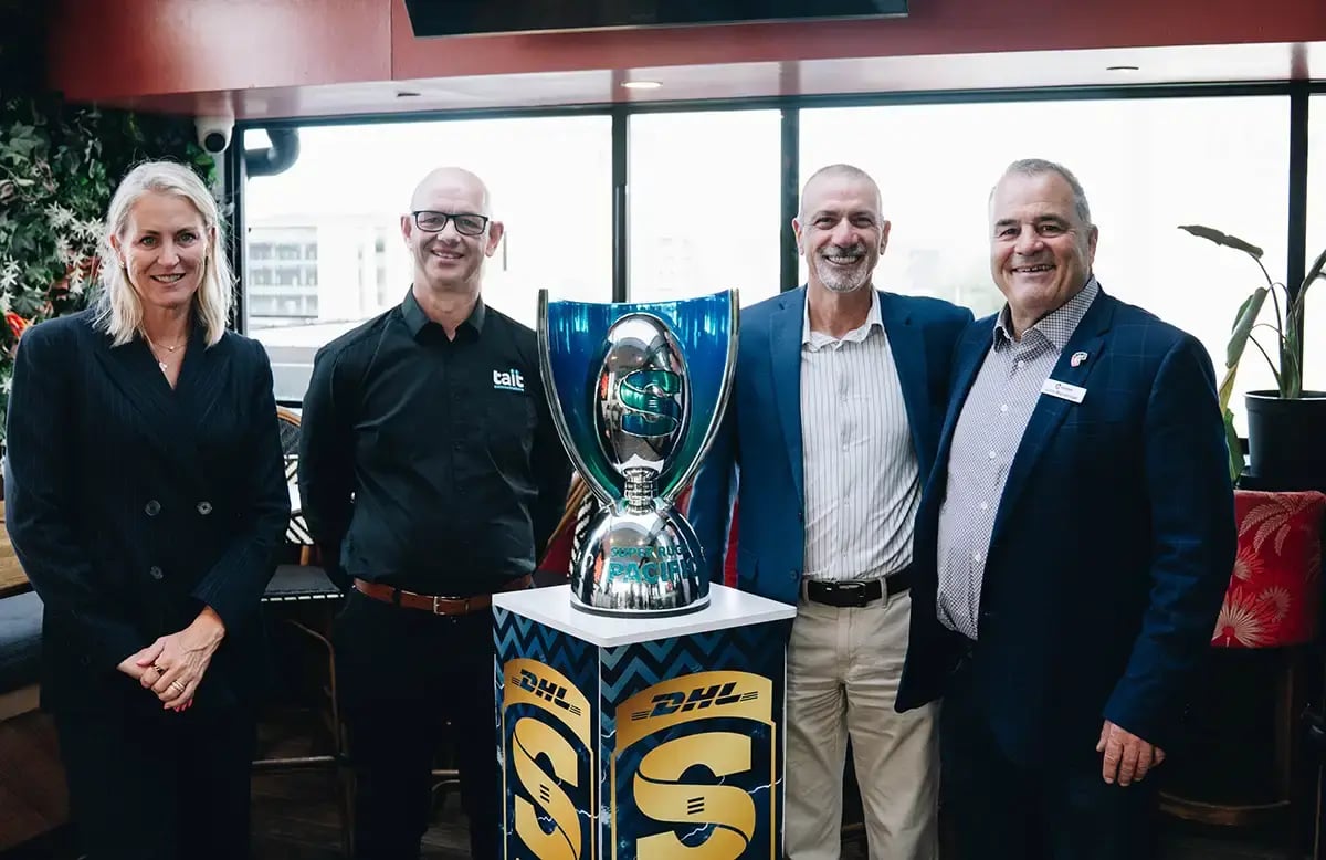 Tait’s Chief Legal Officer Penny Hoogerwerf, Customer Success Manager Richard Moot and CEO Yoram Benit with Crusaders CEO Colin Mansbridge.